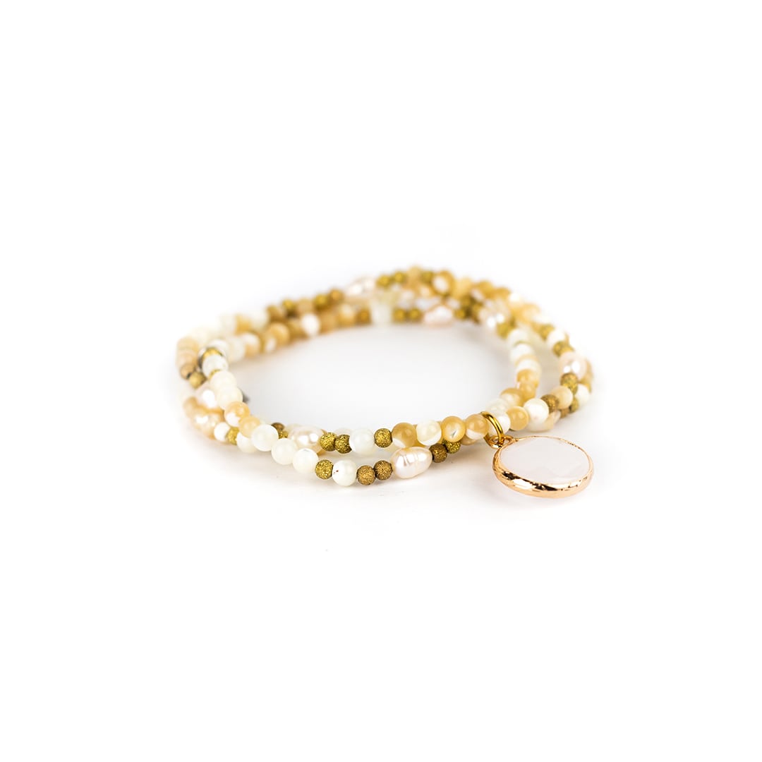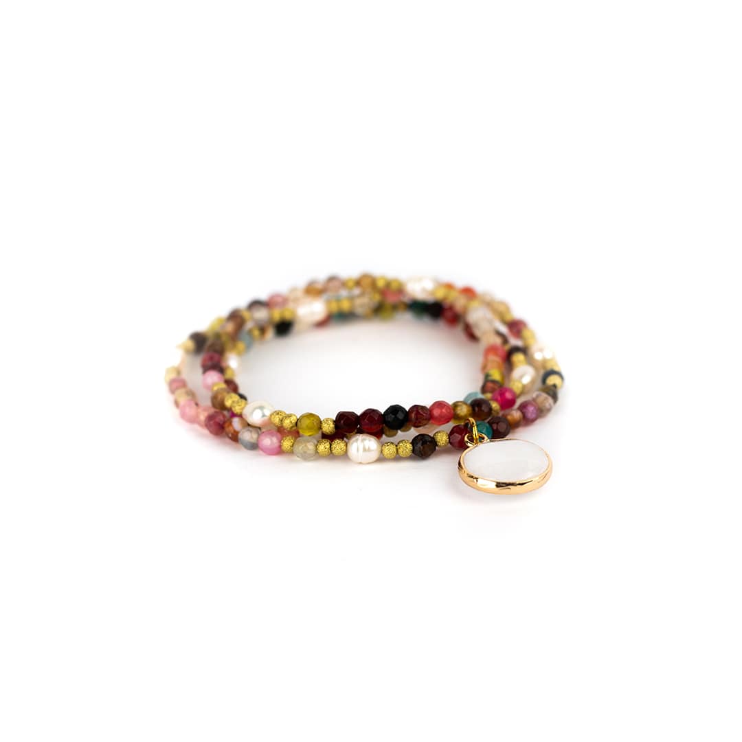 Farbig schimmernde Edelsteine mit feiner Facettierung reihen sich an unser Armband ‚Ani‘ mit zarten goldfarbenen Kügelchen und einzelnen Zuchtperlen aneinander – ein wirklich edles Ensemble, das durch einen in gold gefassten Edelstein ergänzt wird. Mit diesem Accessoire setzt du ein Statement, das jeden Look veredelt.