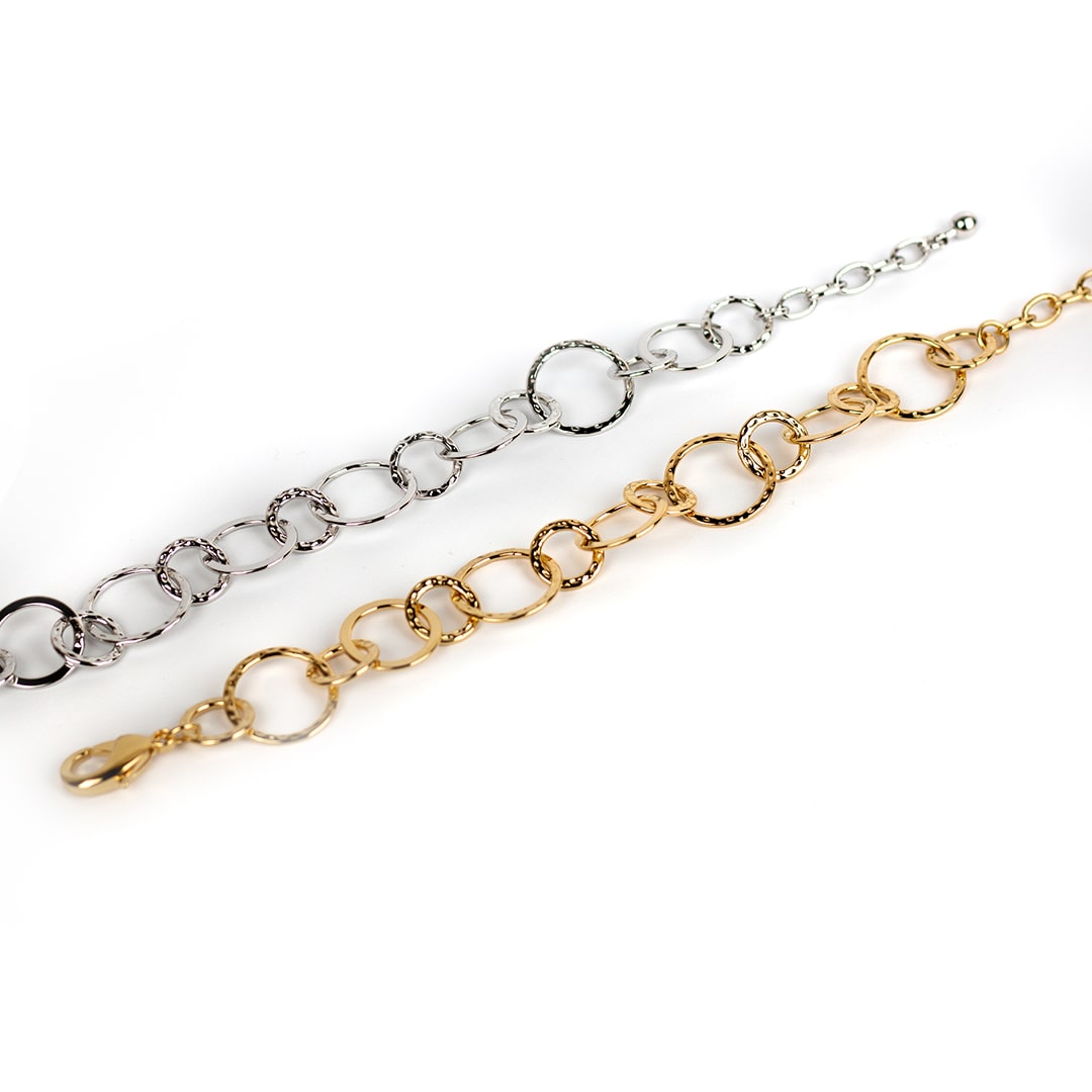 Verschieden große Kreisrunde Kettenglieder aus Schmuckmessing reihen sich bei ‚Mari‘ aneinander. ‚Mari‘ ist perfekt als Key-Piece und unschlagbar in Kombination mit anderen Schmuckstücken. Eben ein toller Hingucker, ob zur Jeans oder zum Abendkleid. Dank des großen Karabinerverschlusses lässt sich das Schmuckstück in jeder beliebigen Länge bis maximal 22 cm tragen und auf deine Wunschlänge einstellen.