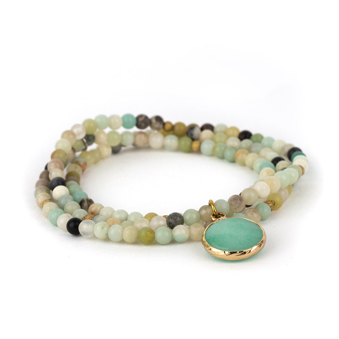 Türkis-/blaufarbig schimmernde Edelsteine mit feiner Facettierung reihen sich an unserer Kette ‚Yuvi‘ mit zarten goldfarbenen Kügelchen aneinander – ein wirklich edles Ensemble, das durch einen in gold gefassten Amazonit ergänzt wird. Mit diesem Accessoire setzt du ein Statement, das jeden Look veredelt.